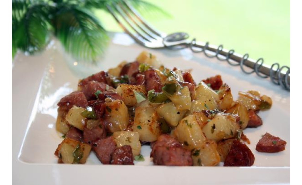In dutch oven, brown potatoes, kielbasa, onion and peppers in oil.