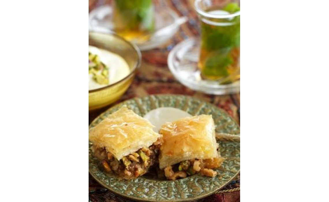 They say never to eat baklava hot or even warm as it is too rich that way, so be patient! Serve with whipped cream and ground pistachios. Note: Will keep for 2 weeks in an airtight container.