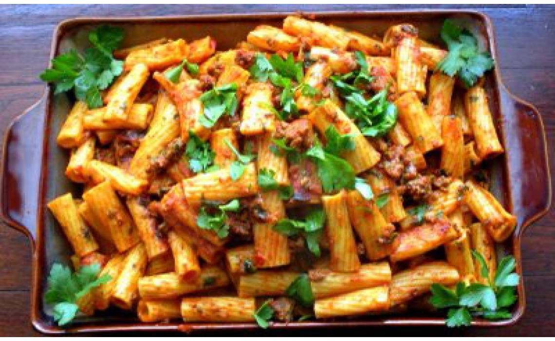 One of the easy and popular meals in our home is macaroni. This is the Iranian version of pasta with meat sauce. Any kind of pasta could be used for this dish. I usually make it with thin spaghetti. However this time I used rigatoni instead. We cook the pasta and the sauce together afterward. It could be baked in the oven or cooked on the stove top over low heat, either way it comes out very delicious.