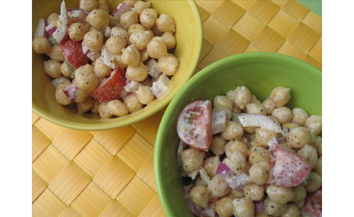 Place chickpeas, onion, tomato, coriander, and mint in a bowl.