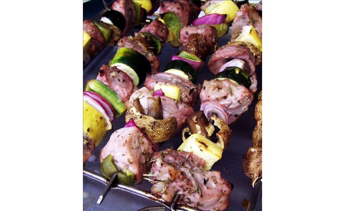 Thread kebabs alternating between the pork cubes and vegetables. Depending on the size of your pork cubes and the length of the skewers, you will have 1 large or 2 small skewers per person.
